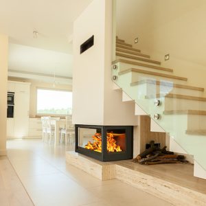 The SAFire Canto Two Built-in Gas Fireplace features a front glass panel, and a side glass panel on the righthand side. This built-in fireplace is the perfect corner wall installation in any divining wall. It provides an impressive, yet simplistic, visual focal point in any living room, kitchen, or dining room. It is perfect for homes, restaurants, and hotels.